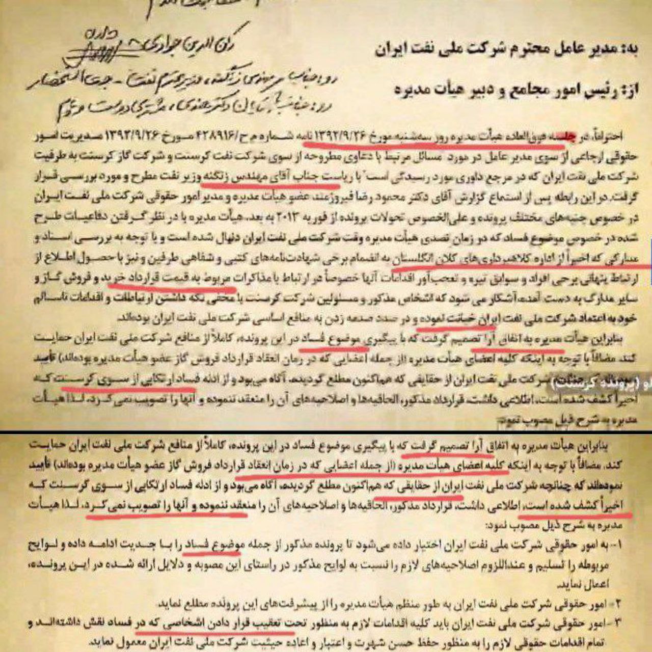 در صورتجلسه آذر ۹۲ در هیئتمدیره شرکت نفت که به ریاست زنگنه برگزار شد صراحتا نوشته شده که «براساس مدارک SFO و شواهد داخلی فساد در قرارداد کرسنت قطعی است و مدیران قبلی شرکت نفت در دوره اول زنگنه در موضوع قیمت گاز به کشور خیانت کردهاند»