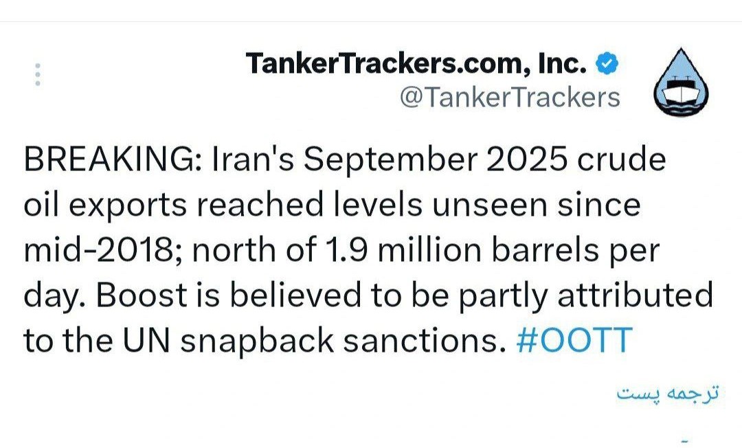 خط انرژی| تانکر ترکرز نوشت: صادرات نفت خام ایران در سپتامبر ۲۰۲۵ به سطوحی رسید که از اواسط سال ۲۰۱۸ بیسابقه بود؛ بیش از ۱.۹ میلیون بشکه در روز.