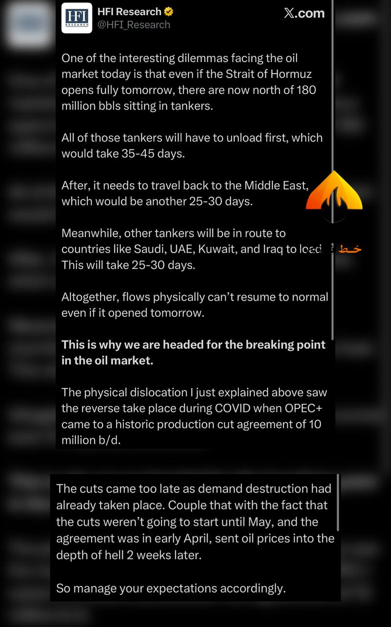 بنابراین بعد از باز شدن تنگه، ۸۵ تا ۱۰۵ روز طول می‌کشد تا شرایط به قبل از بسته شدن تنگه برگردد، البته بدون در نظر گرفتن آسیب‌های زیر ساختی نفتی.