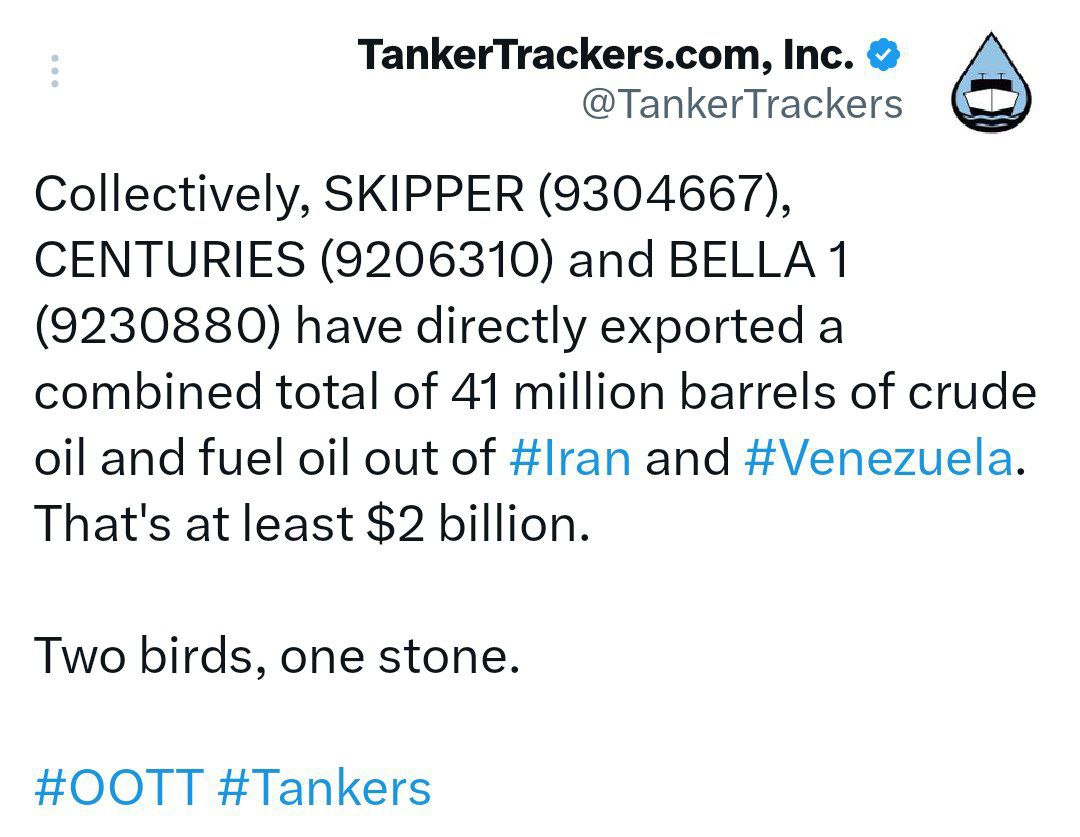 خط انرژیپ طبق گزارش تانکر ترکرز، سه نفتکش توقیف شده توسط ترامپ در آبهای ونزوئلا، مجموعا ۴۱ میلیون بشکه نفت ایران و ونزوئلا را به ارزش بیش از ۲ میلیارد دلار جابهجا کرده بودند.